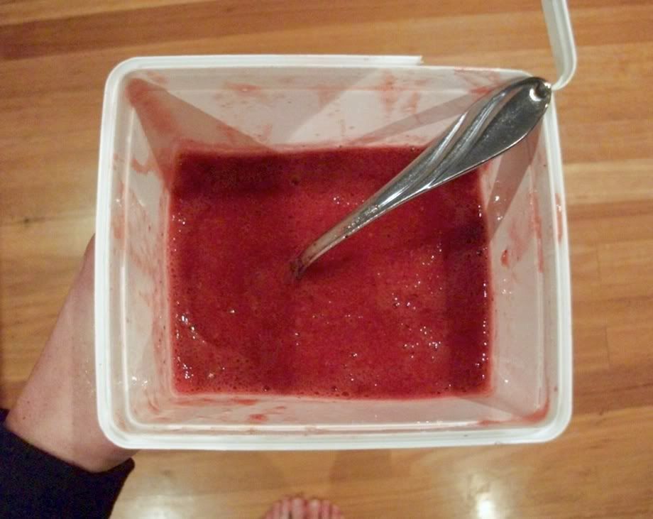basically all you have to do is put all of these in a blender and mix! it's usually a good idea to melt the sorbet a little first if it's too hard, and voila! sweet and sour berry crush. it's usually better to drink it from a giant cup with a straw like a normal person, so just ignore my interesting choice of presentation. oh, and the best part? you can lick the spoon.